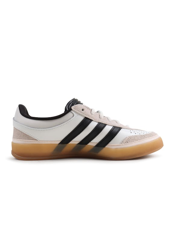 The Bad Bunny x adidas Gazelle Indoor 'Benito' is a stylish collaboration with a cream and off-white upper with black accents and rope laces, while incorporating a warped toe box and perforations for breathability.