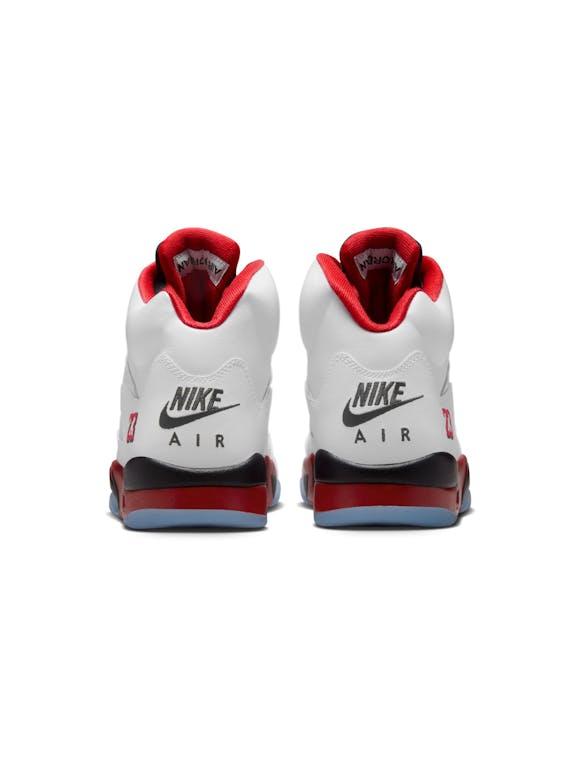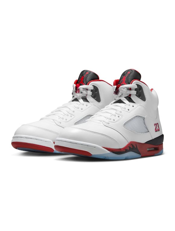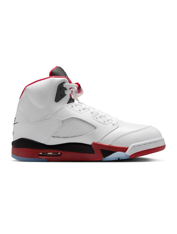 Step into a legend with the Air Jordan 5 Retro. Blending premium leather and textile materials, this timeless classic keeps its iconic details—like the lace lock, shark-tooth midsole, and visible Nike Air cushioning—while delivering comfort built for today. Real and synthetic leather with textiles for durability and structure Nike Air cushioning absorbs impact for all-day comfort Foam midsole adds lightweight cushioning Rubber outsole provides traction and grip Iconic lace lock and shark-tooth midsole design