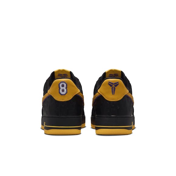This particular Nike Air Force 1 Low showcases a color palette of Black, Varsity Maize, and Varsity Purple, reminiscent of the Los Angeles Lakers' "Hollywood Nights" jerseys. The upper is dominated by a sleek Black, while Kobe Bryant's iconic shield logo appears throughout in debossed form. Adding a touch of team pride, the Swoosh logos on the side panels, tongue label, heel overlay, "AIR" on the midsole, and rubber outsole are all highlighted in Yellow. Limited to only 8,000 pairs, each shoe is individually numbered on the insoles. To complete the design, Purple accents the Swoosh and branding on the tongues.