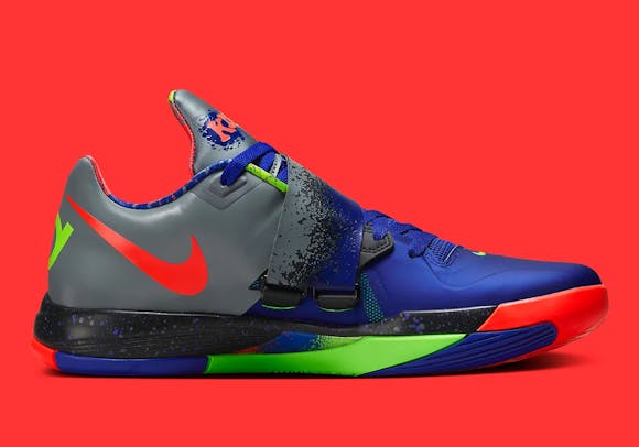 The Zoom KD 4 'Nerf' is a collaborative effort between Kevin Durant and Nerf, showcasing a lively color scheme and incorporating the brand's classic colors and design. The midsole and midfoot strap feature a splattered graphic, while the tongue tags display logos from both Nerf and KD 35 in the toy company's lettering. The sneakers also come with a Nerf hoop and basketball to complement the collaboration.